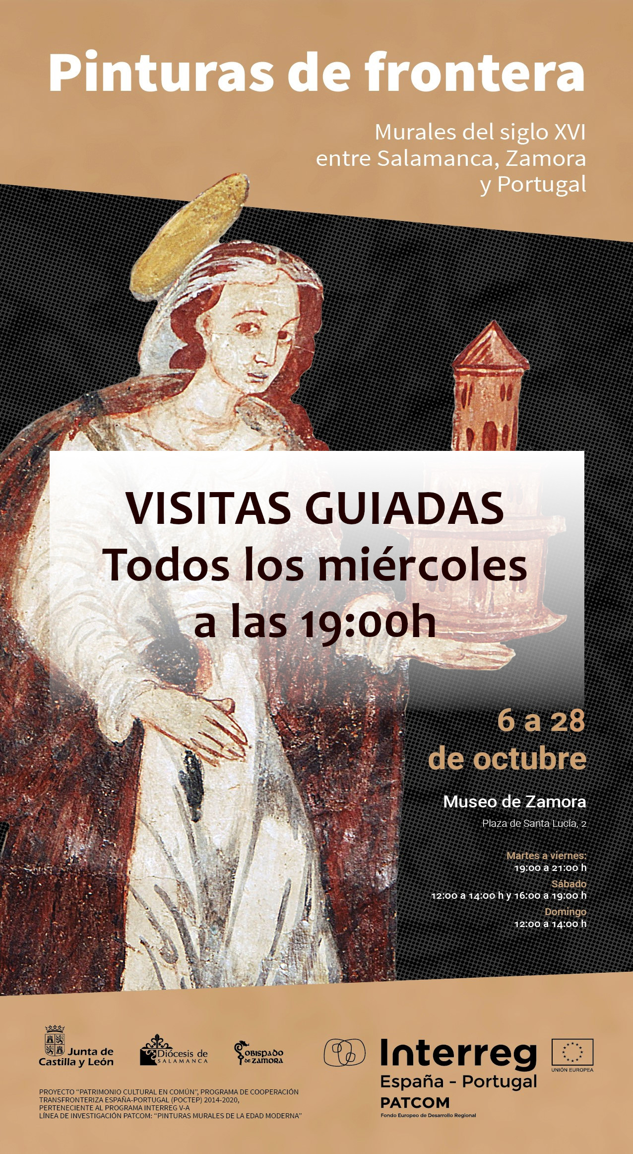 Este miércoles 28 de octubre a las 19:00h, tendrá lugar en el Museo de Zamora la última visita guiada a la muestra temporal «Pinturas de frontera. Murales del siglo XVI entre Salamanca, Zamora y Portugal»: El patrimonio formado por las pinturas murales conservadas en las paredes de iglesias y ermitas de las comarcas fronterizas con Portugal de Sayago, en Zamora, y del noroeste de Salamanca, junto con aquellas que se encuentran al otro lado de la Raya, forman un foco propio de decoración pictórica realizado en torno al siglo XVI por cuadrillas de artesanos itinerantes que atendían las demandas de la zona y que, a pesar de la modestia de recursos, incorporaron las novedades estéticas del Renacimiento a sus obras. En Zamora, son especialmente destacables los conjuntos murales de Carbellino, Badilla (Fariza), Muga de Alba o Muga de Sayago.